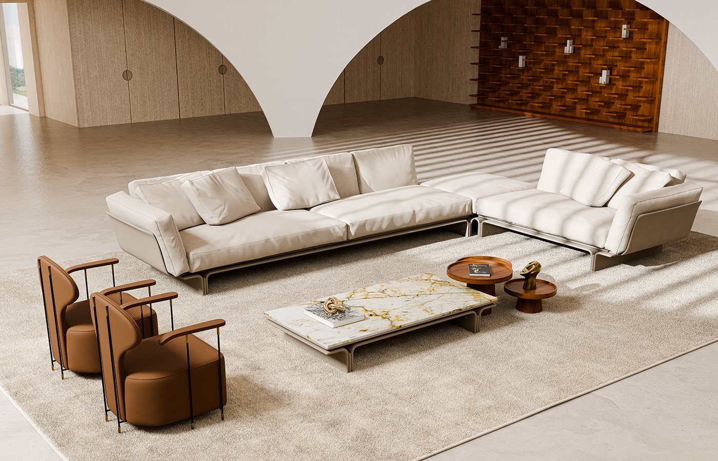 Divano Jazz, realizzato con impareggiabile maestria, ogni dettaglio è una testimonianza della meticolosa lavorazione artigianale Mascheroni. La grazia fluida della base fluttuante sostiene il peso dei morbidi cuscini.