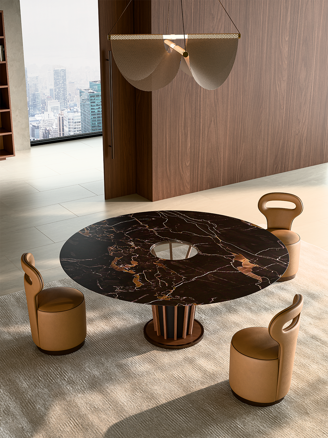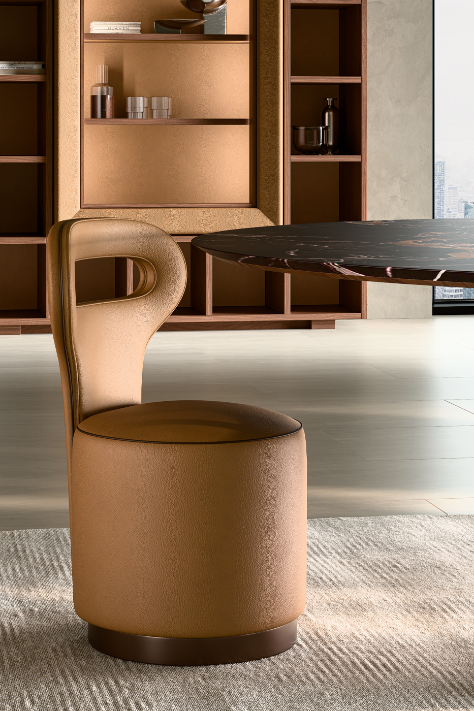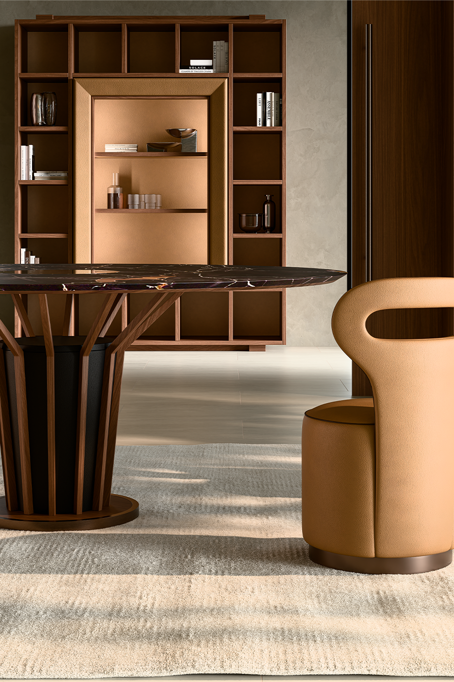 Abbiamo immaginato una soglia. Un luogo dove la precisione di una decisione e la calma di una cena condividono lo stesso spazio.Al centro, la tensione statica di LifeTree. Non è solo un tavolo, è un'architettura costruita su contrasti materici. Le radici in Noce Canaletto avvolgono un ceppo centrale rivestito in pelle, sostenendo la gravità di un piano in Marmo Portoroda 180cm, scuro e profondo.Attorno, il contrappunto delle Polo Pouf. Volumi morbidi in pelle Mascheroni 3M/A Sabbia, definiti da un piping in 3M/A Cioccolato che ne disegna la silhouette.