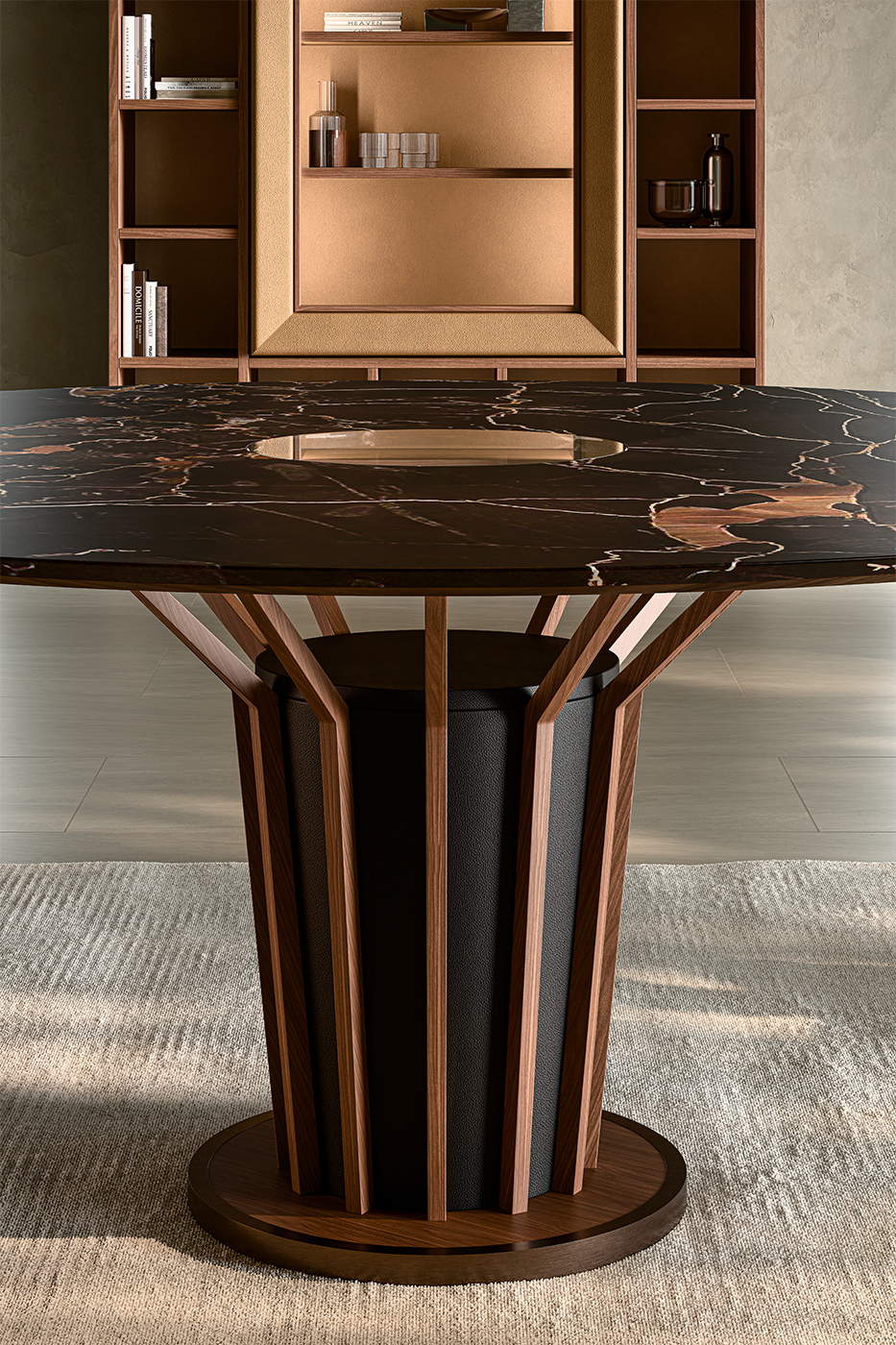 Non gambe, ma radici. La sfida di LifeTree era sostenere l'imponenza del marmo senza appesantire lo sguardo. La risposta è nel movimento: tre elementi in Noce Canaletto massello che non cadono perpendicolari, ma si avvitano attorno a un fulcro centrale. Questo "cuore", rivestito sartorialmente in pelle, non è solo estetica: è il punto di connessione che assorbe le tensioni e trasforma la struttura in un corpo unico, organico e indistruttibile.