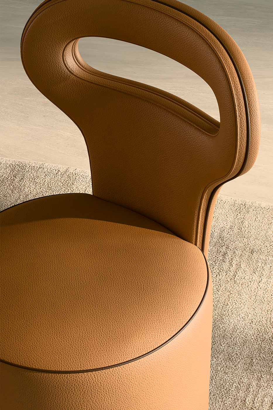 Sono volumi sferici pensati per annullare le distanze. La pelle 3M/A Sabbia veste la forma come un guscio continuo, mentre il piping in 3M/A Cioccolato non è semplice decoro, ma un orizzonte grafico che disciplina la morbidezza.