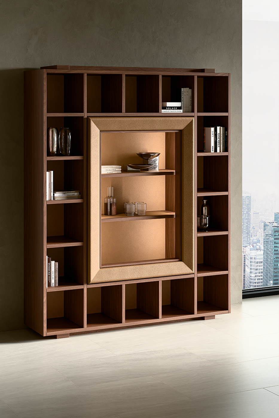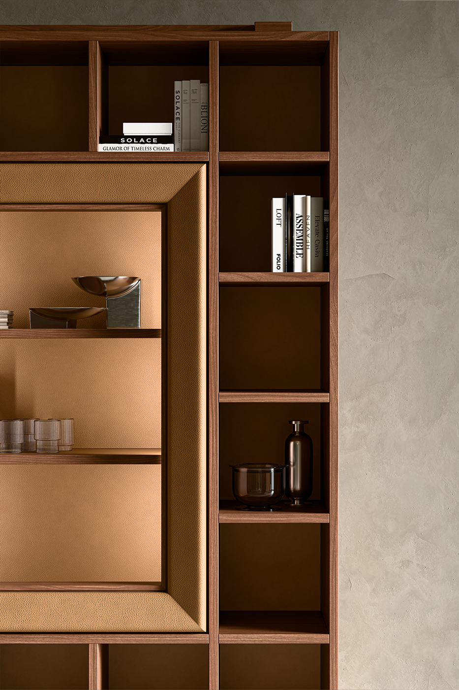 Ogni orizzonte ha bisogno di un fondale. Sullo sfondo, il mobile Romeo si alza a fare da contrappunto all'orizzontalità di LifeTree. Le sue trasparenze in vetro e la struttura in Noce Canaletto non chiudono lo sguardo, ma lo filtrano, creando una profondità che dilata lo spazio. Non è solo un contenitore, è la memoria della stanza: una vetrina illuminata che custodisce gli oggetti, riflettendo la luce e l'atmosfera della cena.