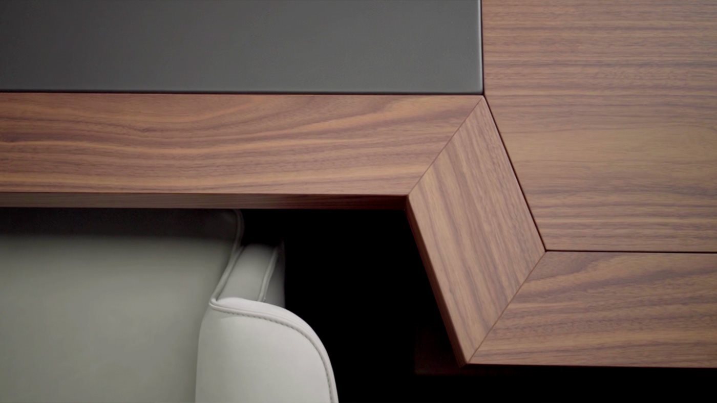 Il nuovo progetto esplora l’effetto tattile del legno materiale naturale per eccellenza, ed il calore del noce canaletto, legno massello che presenta un’elegante tessitura a venature fiammate contrastate da toni più chiari, coniugando così anche le nuove esigenze di eco sostenibilità senza però sacrificare il bisogno di importanza che ogni ufficio di rappresentanza merita.