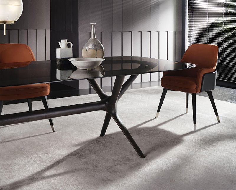 Il tavolo ovale offre un tono sofisticato e moderno con la capacità di declinarsi in appoggi statuari da ammirare (e non solo utilizzare). Il design non troppo squadrato, ma curvo ai lati, addolcisce la percezione dell’ambiente intero e ridisegna lo spazio attribuendogli un tono equilibrato. La forma morbida delle gambe è messa in tutta evidenza dalla crociera che si presenta con una sezione arrotondata e raccordi plastici dei nodi.