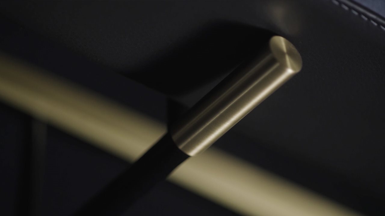 Dall’avvolgente guscio in pelle dal bordo esterno decorato da preziosissime cuciture a mano realizzate a contrasto, che sottolineano e valorizzano il sinuoso design di questo oggetto.
