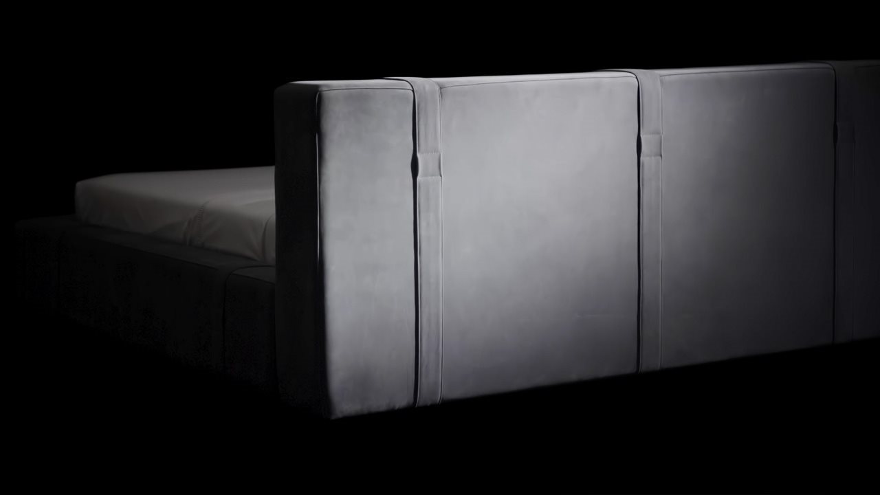 A contrastare la sua orizzontalità, il design è ingentilito da un gioco di cinghie in pelle con passanti, raffinate cuciture sartoriali verticali che ne modellano la testiera imbottita e l’intera struttura.